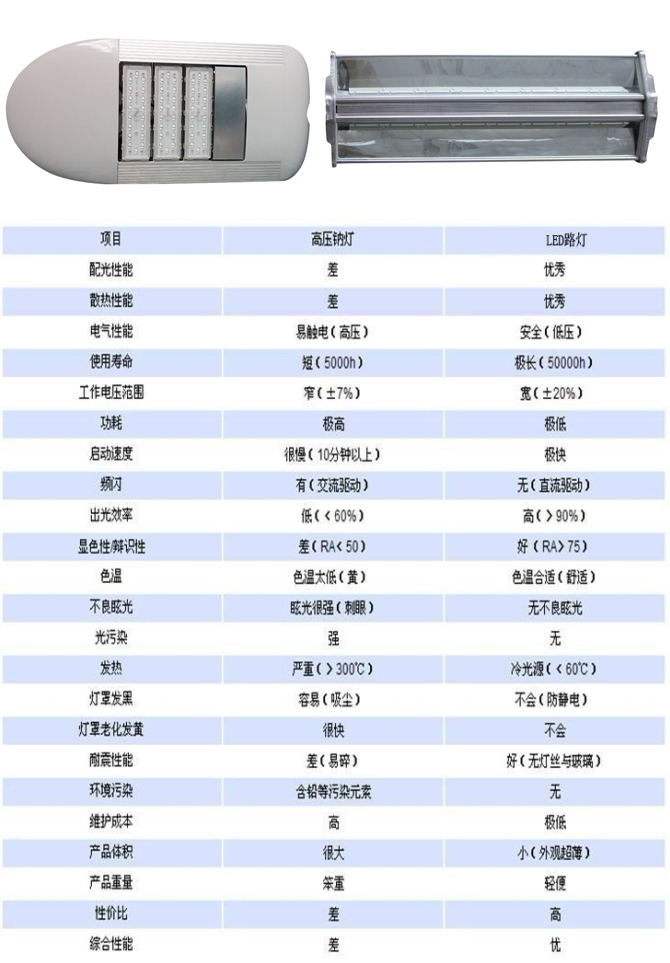 LED路灯灯具采用科瑞、飞利浦、欧司朗或台湾晶元芯片的防水模组以及自主研发生产的COB面光源,光线更柔和。外壳采用阳极氧化铝型材加钢化防护玻璃,全密封设计,防水等级IP65以上,安装尺寸口径上与传统的灯头相同,直接替换,功率有20W、30W、50W、90W、120W、150W、180W、200W、250W等,可根据客户需求订做。