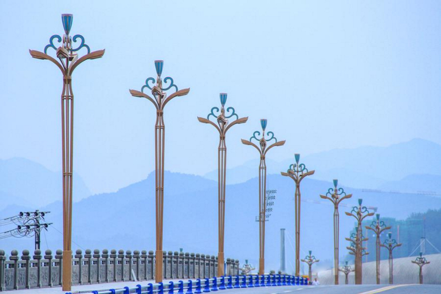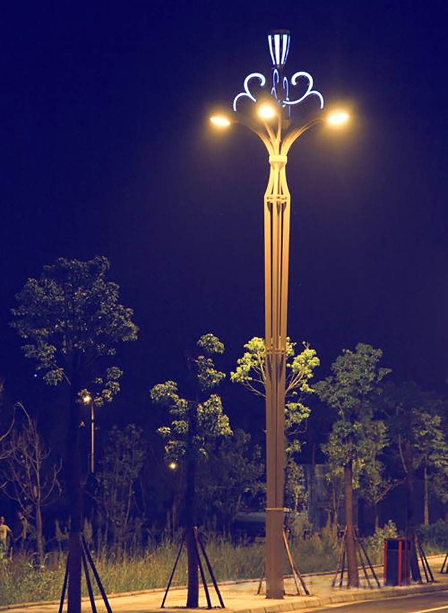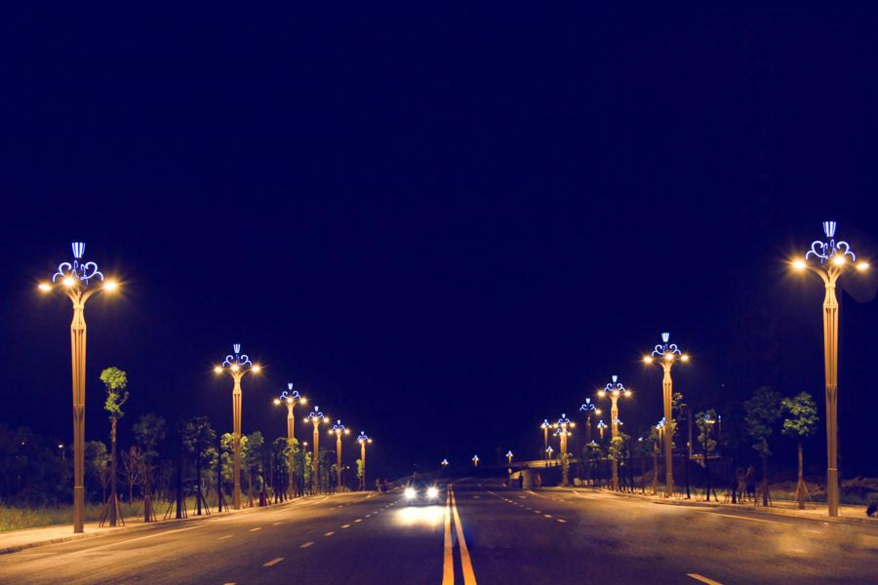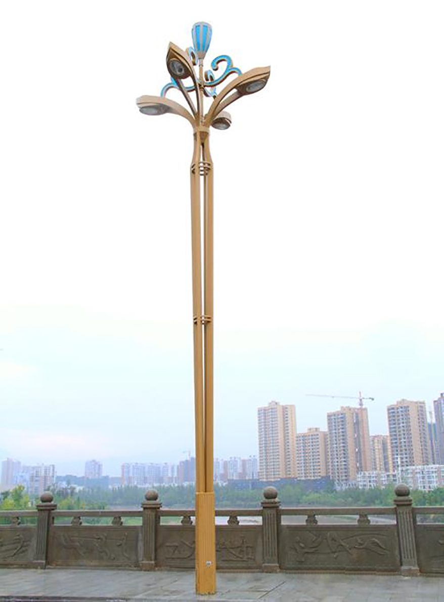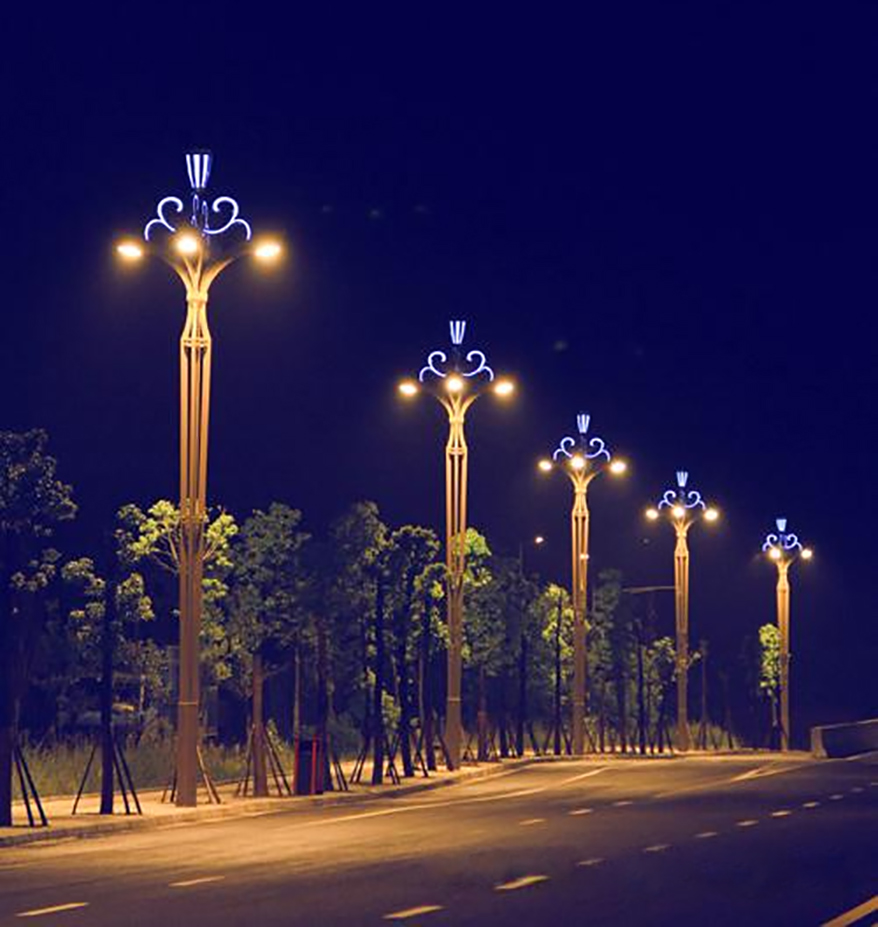 本工程为互通式立交桥,全长871.794,米。本公司为该桥段量身选取了一款文化景观路灯—金荷灯。金荷灯,灯型以莲花为创作元素,经过设计者的提炼,将莲花与花瓶的形态相结合。灯顶,采用莲蓬的造型生动形象,流畅的花纹连接件,表现了莲花的婉约清雅。独特的灯杆造型更使得整个灯具产生亭亭玉立之感。灯底部花纹造型为传统水纹,表现出莲花出水的形象姿态。本项目共使用了93套金荷灯,主杆采用优质矩管,灯头主光源采用高压钠灯,装饰光源采用定制蓝色LED 光源。夜间在钠灯暖光的衬托下,蓝色装饰光源更加耀眼,使得整灯给人高贵典雅之感。