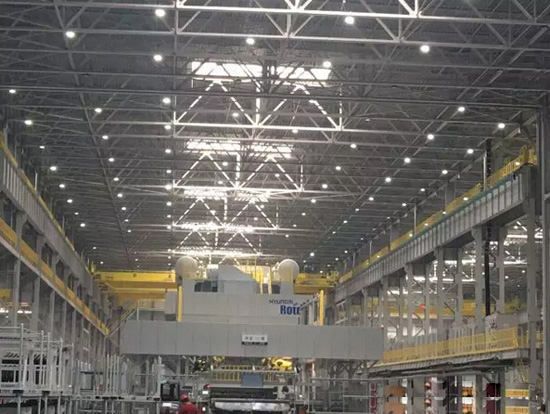 在安装时通过调节灯具安装的位置,利用灯具遮光角,有效防眩,使厂房内照度非常均匀,无死角,减少眩光危害。色温舒适、照度柔和,即使长期工作在厂房也不会造成视觉疲劳。
