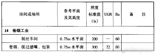(3)卷包、制丝、动力车间辅房照明:功率密度:8.8W/m2,照度值:300lx;