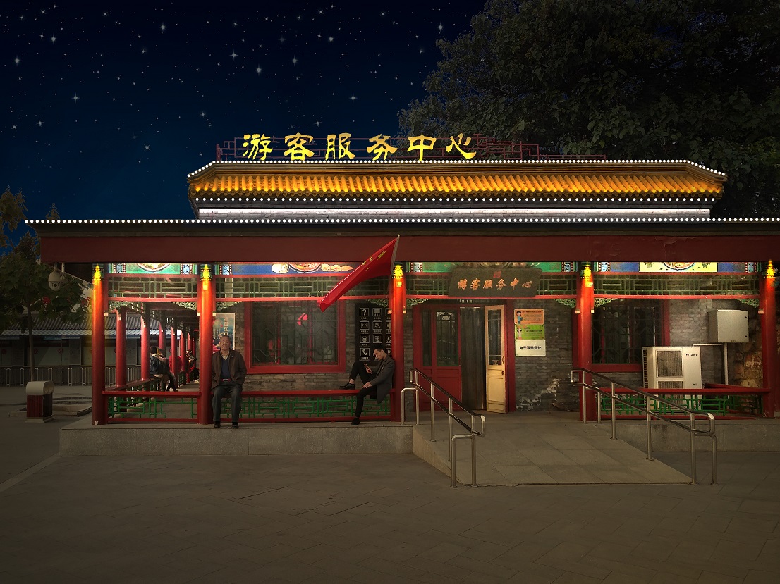 石家庄华亚照明科技有限公司对北京圆明园外景设计:1、南门建筑物包括正南门与售票处和游客服务中心,该部分建筑物是中国古代建筑文化的全面表现,又是南门标志性的建筑,整体特点均青砖灰瓦、雕梁画柱,尽管年代久远,但依然保存完整,屋面飞檐气势轩昂大气