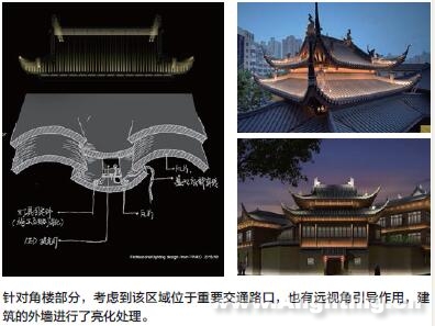 3、本次设计主要以LED点光源、LED线条灯、LED瓦楞灯组成, LED灯具由于在体积、工作温度上的优势,在层层叠叠的斗拱处能起到安全、见光不见灯的重点照明作用。