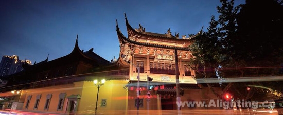 全开模式是在重大佛事活动期间,最耀眼的灯光状态。在这个模式下,仅是位于安远路江宁路口的角楼,从地面到屋顶,就有多达七个灯光层次。平日模式,表现圆明园的幽静禅意,同时也为周边居民考虑,控制建筑照明的亮度。通过走廊、立柱、台阶照明,为日常夜间僧人的通行提供基础功能性照明。在平日模式中,瓦面上仅保留了屋顶翘角的光感,既能在很大程度上节约能源,同时又不失优雅。而间接的环境光及柔和的光感又能在保证深夜通行不刺眼的同时,有一定的环境亮度,并保留一部分景观照明。在深夜模式开启时,设计方案中只保留了殿堂的牌匾投光,并关闭所有殿堂二层以下的瓦面翘角投光,让寺院整体回归平静状态。而以灯光的手段进行视觉引导,把周边的行人带到心灵舒适的境地,这也是灯光设计的真正意义所在。