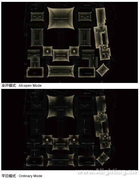建筑顶部在整体照明前提下设置重点特色照明,对应各模式进行开关控制,呈现丰富的表现效果。