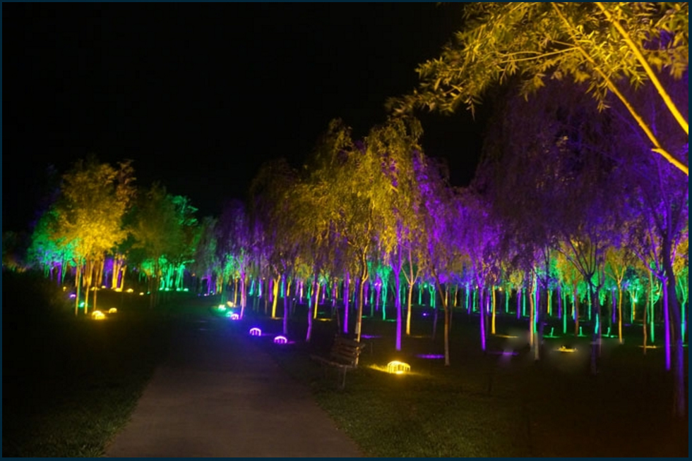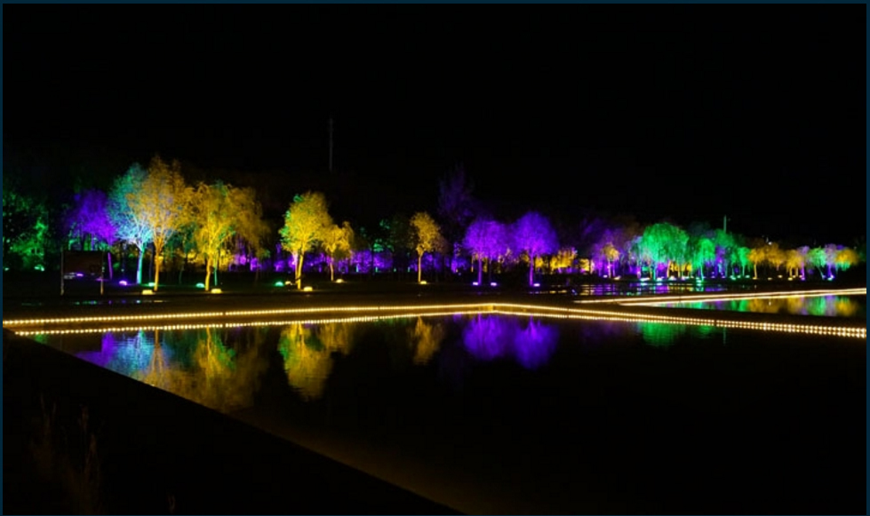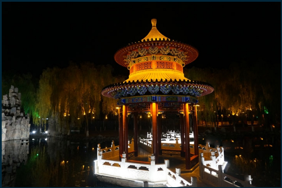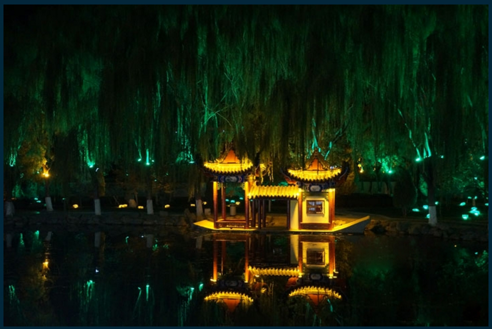 近年,随着旅游产业的迅速升温,加快了旅游资源的开发建设,完善旅游服务配套功能,先后完成公园等景观亮化工程。公园有诸多富有民族特色的街道、鼓楼、牌坊、公园亭阁等,在夜景灯光的妆扮下,展现出迷人的景观,引人驻足欣赏。亮化设计以特色化、人文化的艺术光环境为核心,构建出“以水为脉”的魅力新形象,使亮化建设进一步提升城市环境品质,积极促进城市旅游产业发展。