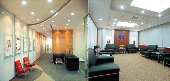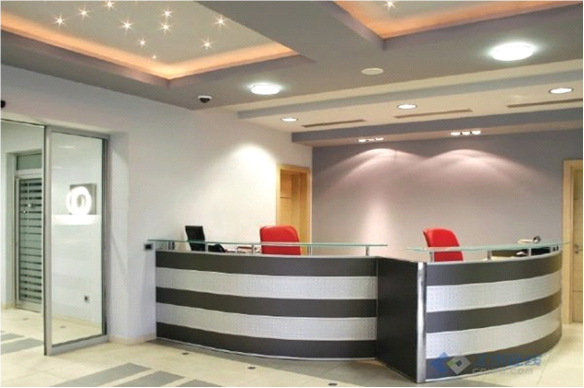 一、前台作为企业的窗口,不仅展示着企业的实力,更突显企业本身的文化内涵,需要结合公司整体定位与装饰特点来制定相应的照明方式。照明的整体亮度要求很高,可采用筒灯作为基础照明,同时以翻转式射灯或导轨射灯对背景形象墙重点照明,达到突出企业形象、展示企业实力的效果。