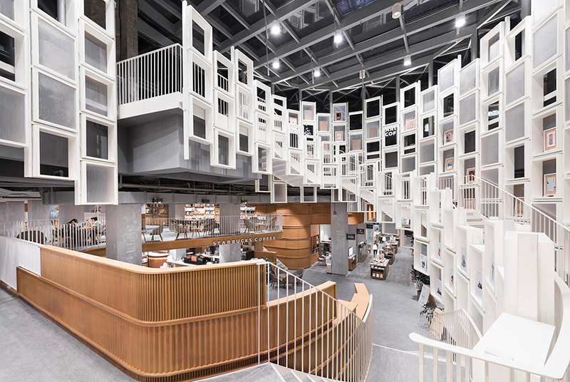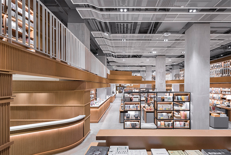 筑蹊生活书店设计了流动且富有变化的空间,其有机的几何与循环的路径作为具有推动力的“运输工具”,在触发人们好奇心的同时,将全新的生活方式带入公共空间和商业场景之中。建筑师与委托方自项目初期便确立的共同目标是,设计一个供人们闲逛和消遣的场所,将阅读作为核心功能,并为之补充一系列丰富多样的活动空间,使顾客能够就座、阅读、学习、参与工作坊以及现场活动;带来超越传统售书模式的全新体验,使该项目成为宁波及其周边地区的全新生活目的地。