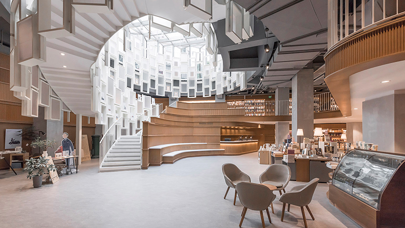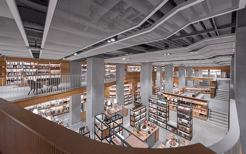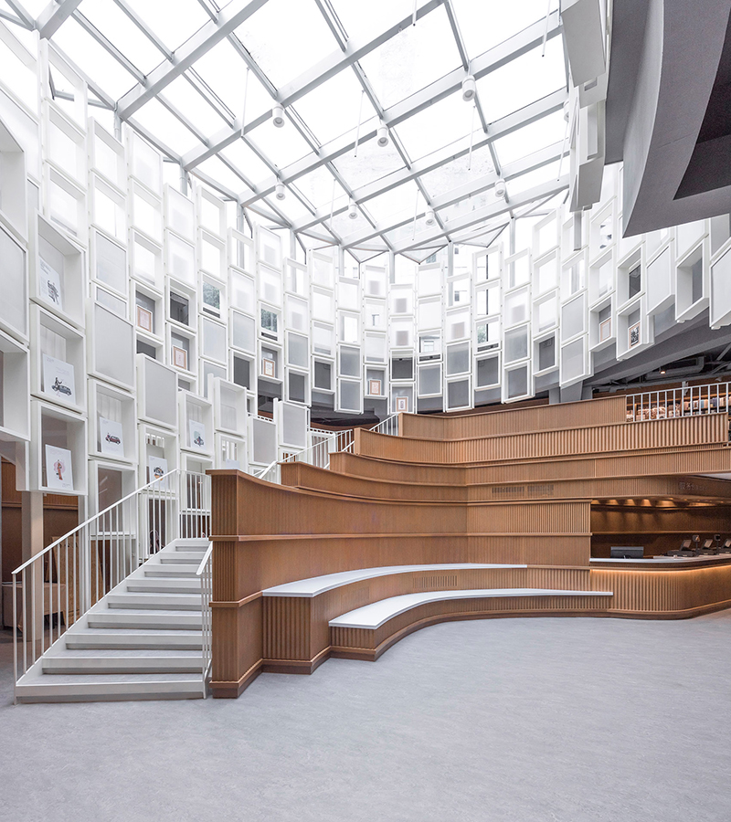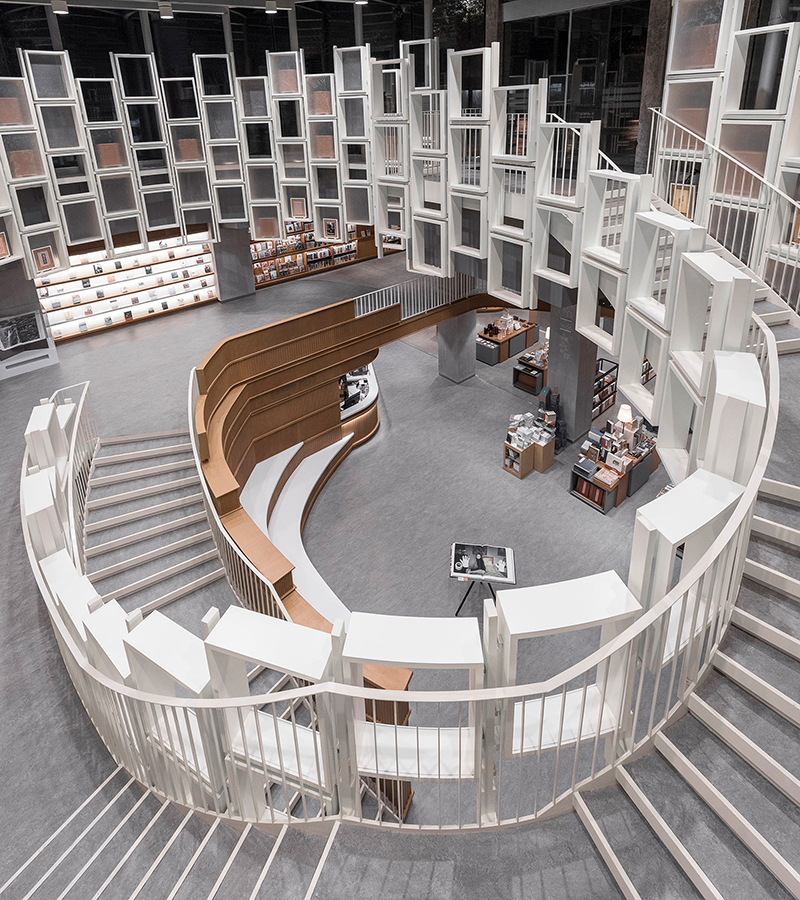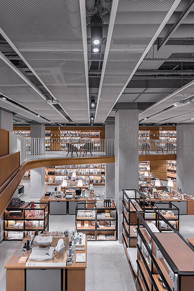 穿过以石材铺设的广场中央的玻璃廊亭,便来到位于首层的主入口。巨大的悬挂式楼梯宛如盘旋的书架,将入口与夹层以及下方的主楼层连接在一起。白天,自然光从这座玻璃廊亭倾泻于书店内部,半透明的亚克力板在滤过阳光的同时,与白色的书架模块融为一体。夜晚,室内的人造光反过来将玻璃廊亭点亮,使其成为书店中闪闪发亮的陈列柜,同时也可用于各种各样的活动。