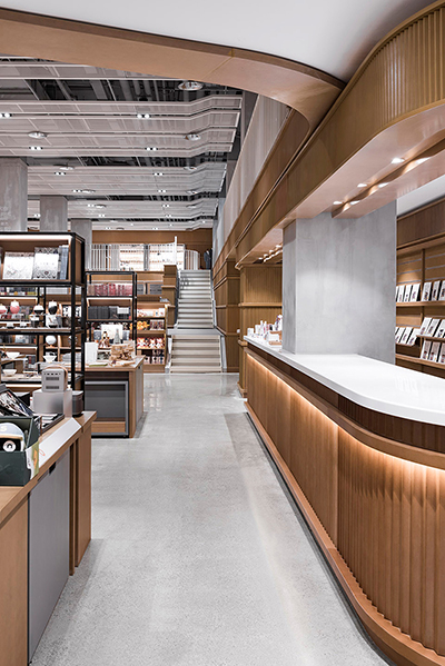 楼梯首先到达就座区和阅读区所在的夹层,继而进入主要的地下楼层。4座楼梯为这两处空间提供了额外的纵向连接。环顾四周,墙壁上排列着通高的书架,犹如一条在整体空间中不间断循环的缎带,将不同的功能空间彼此区分或联系起来,引导顾客完成一场充满变化的书店之旅。