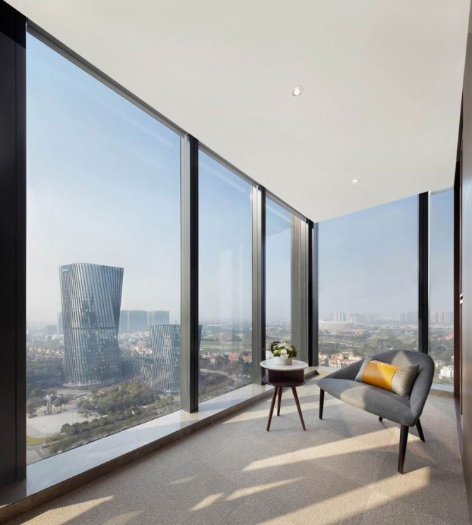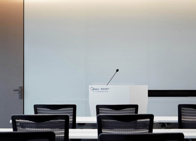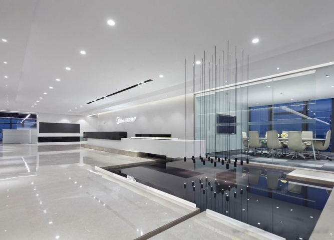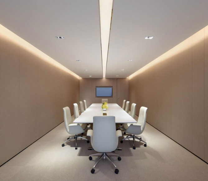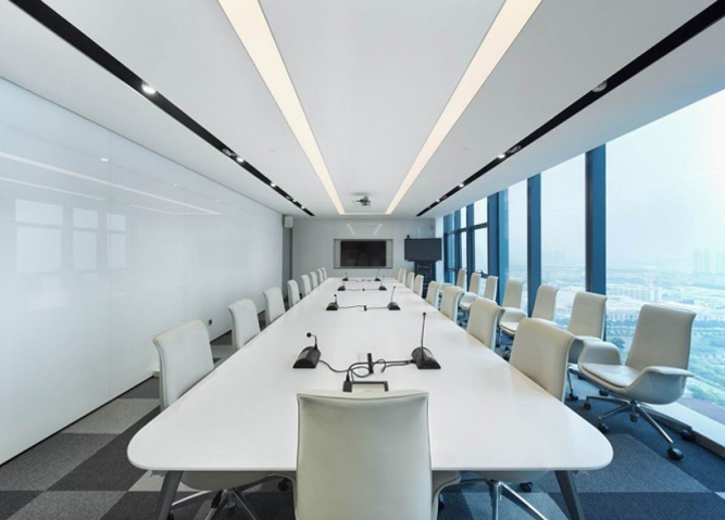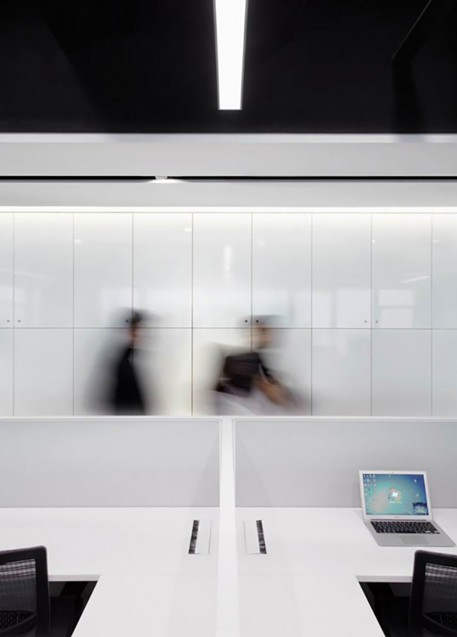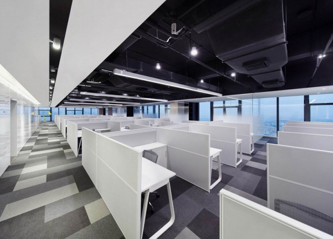 办公空间整体以开放的姿态呈现,由接待区、办公区、会议培训区和总裁办公区四个区域组成。办公区可容纳70人办公,利用渐变玻璃作半围合隔断,在形成独立总监办公区的同时,还能让所有员工享受窗外风景。白色与浅灰的办公家具搭配跳跃的拼色地毯,营造严谨而活泼的办公氛围。