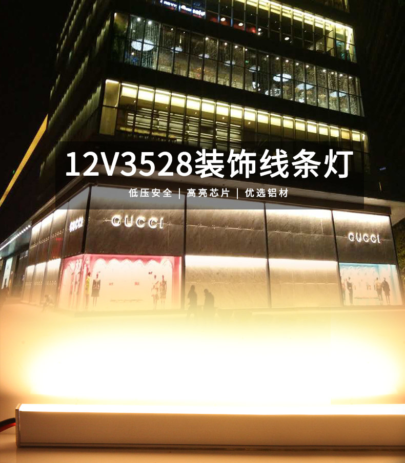 LED线条灯既有线型光源特征又有面型光源特征,色彩丰富,是一种新型高档户外亮化灯饰产品。LED光源高效节能,亮度高,无紫外线、无频闪,光线均匀无光斑。固体光源,防震防爆,安全性好。铝质外壳,阳极氧化或静电喷塑处理,耐酸耐碱,高抗紫外线。恒压24V供电,安全稳定。自带安装支架,便于安装调试,仰视角可调。使用期间免维护。适用于户外环境,防水防尘。应用于楼体亮化、立交桥亮化、店面形象装修以及各种专卖店局部照明等,也广泛应用于家居照明。